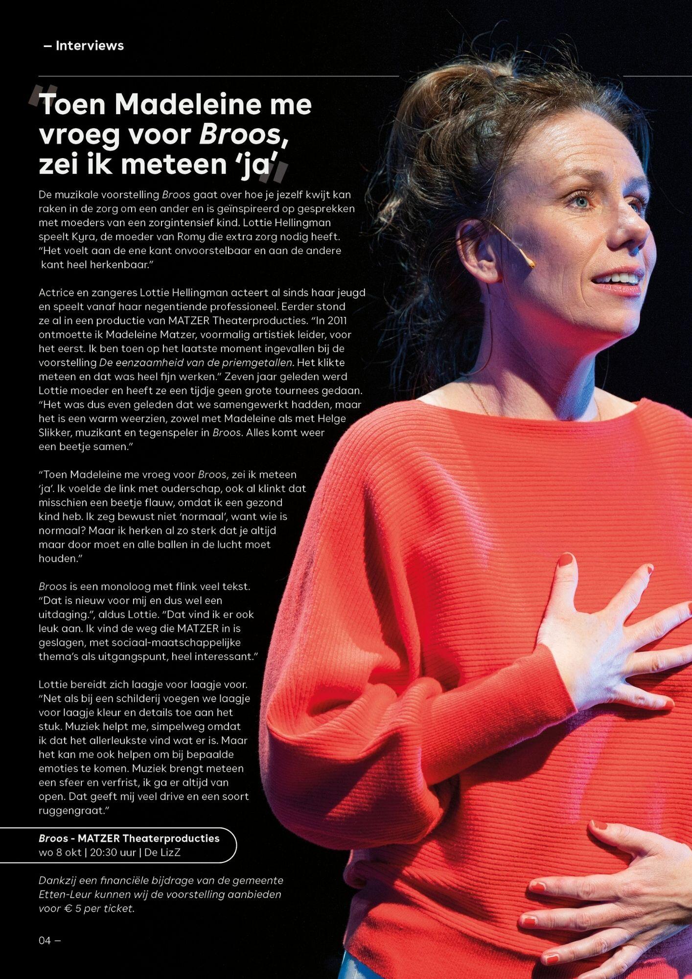 Broos is een voorstelling over het verborgen gebied mantelzorg. Over hoe het is als mensen altijd vragen naar degene voor wie je zorgt, maar zelden naar jou. Als je je dat zelf eigenlijk niet eens meer afvraagt en er steeds een beetje minder van jou overblijft. En wat gebeurt er als jij omvalt? Dat kan niet. En dus ga je door.