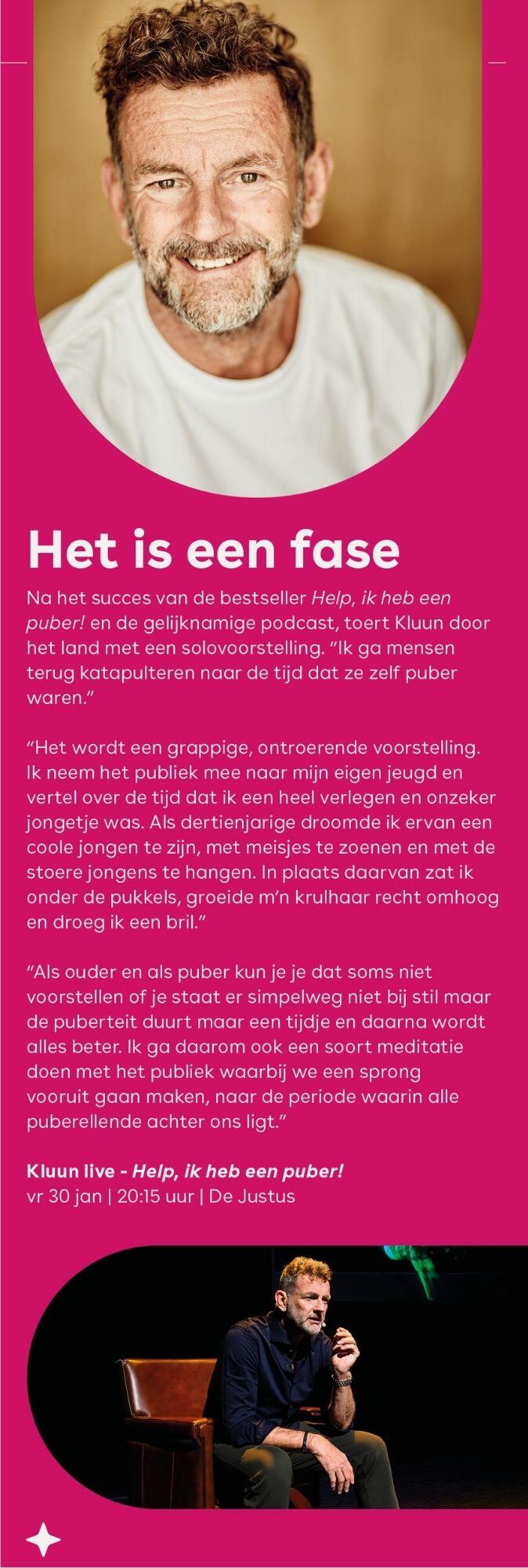 Kluun neemt je mee langs alle obstakels die pubers onderweg tegenkomen. Van onzekerheden en chaos tot de hormonale stormen en het onbegrip tussen ouders en kinderen. Of je nu een ouder bent van een puber, een pre-puber in huis hebt, of simpelweg zelf ooit een puber bent geweest – deze voorstelling is voor iedereen die de puberjaren (over)leeft of probeert te overleven.