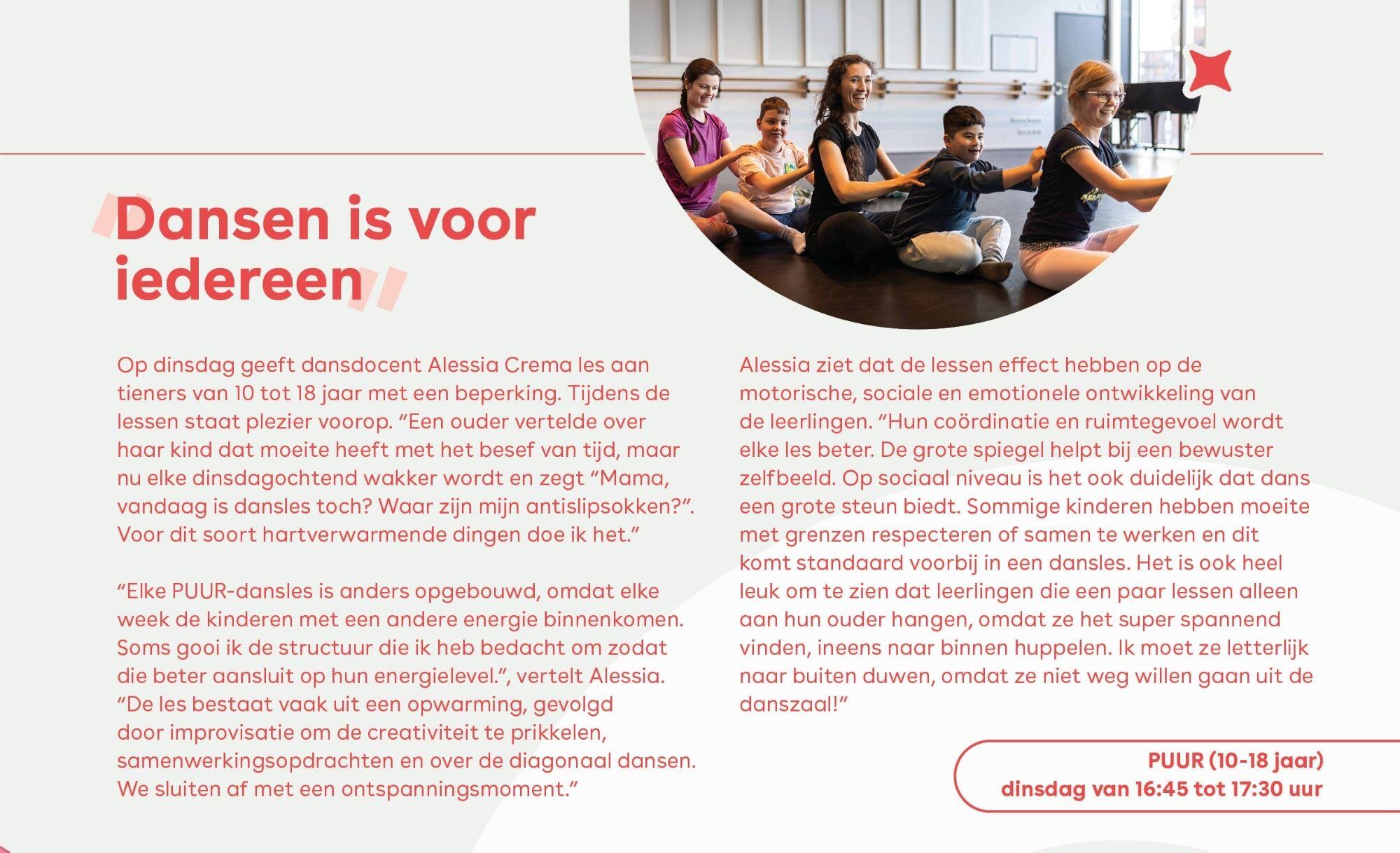 “Elke PUUR-dansles is anders opgebouwd, omdat elke week de kinderen met een andere energie binnenkomen. Soms gooi ik de structuur die ik heb bedacht om zodat die beter aansluit op hun energielevel.”, vertelt Alessia. Lees hier het gehele interview.